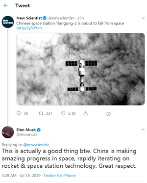 马斯克转发天宫二号…