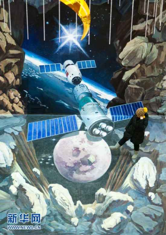 在长春市红旗街万达广场内,一幅巨大的“神八奇妙的太空之旅”4D立体画吸引了众多市民的目光,立体逼真的效果使观众感觉身处宇宙之中,遥看神舟八号和地球。