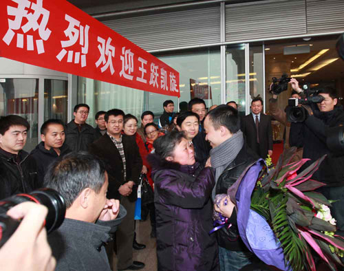 圆满完成火星500试验的中国志愿者王跃,于12月6日7时20分从俄罗斯乘飞机抵达北京首都国际机场,这是他历经520天密闭试验后首次踏上祖国土地。中国载人航天工程办公室、火星500项目中方试验队代表以及王跃父母前往机场迎接,王跃所在单位--中国航天员中心在航天城举行欢迎仪式迎接王跃凯旋。