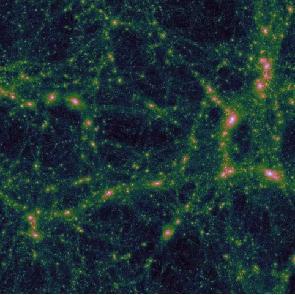 图1: 暗物质主导了结构形成, 星系在由暗物质主导的暗晕中形成和演化。图示为超级计算机模拟的结构形成,边长大概2亿光年。 从黑色、绿色、黄色、粉色到白色显示了密度从低到高的变化,暗晕对应于白色的高密度区域。 在以暗能量和冷暗物质主导的标准宇宙学模型下,星系在暗物质晕中形成和演化。在大质量的系统中,重子比例可达到宇宙的平均值,这一比例随着暗晕质量的减小迅速降低。由于低质量系统束缚重子的能力比较弱,在矮星系系统中,通常认为其重子物质含量相对于暗物质是非常少的,这也在我们银河系和本星系群的卫星星系中得到证实。不同于大的星系,在这些卫星星系中,即使在半光半径之内,都是暗物质主导的。遗憾的是,由于矮星系的光度非常暗,目前关于矮星系中的动力学研究只能局限在非常近邻的宇宙中,大部分在本星系群内或者本星系群周围。