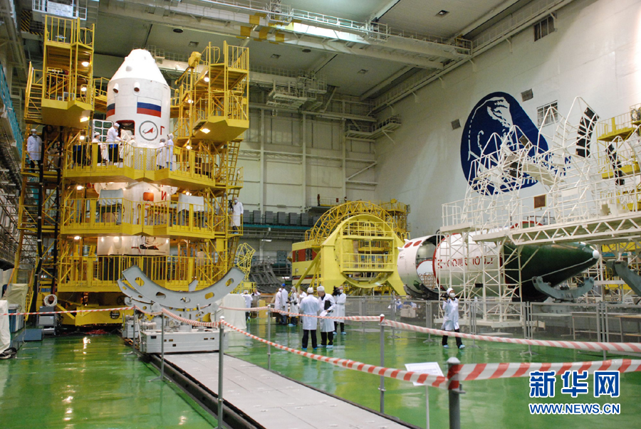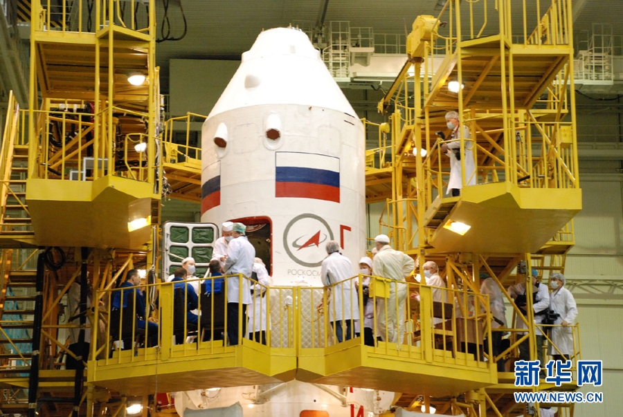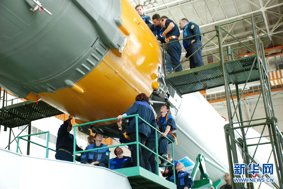 4月1日,工作人员在位于哈萨克斯坦境内的拜科努尔发射场总装车间对俄罗斯“联盟TMA-21”载人飞船进行总装。