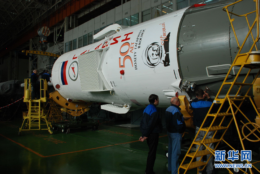 3月31日,工作人员在位于哈萨克斯坦境内的拜科努尔发射场总装车间对俄罗斯“联盟TMA-21”载人飞船进行总装。俄罗斯“联盟TMA-21”载人飞船4月1日总装完毕。据俄罗斯联邦航天署发布的消息,飞船计划于当地时间4月5日凌晨发射升空。由于此次发射临近苏联宇航员尤里·加加林实现人类首次太空飞行50周年,飞船特别被命名为“加加林”号。