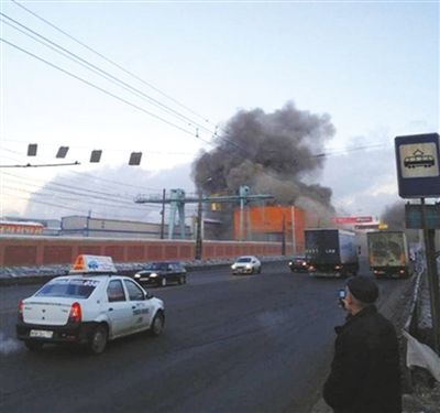 15日,车里雅宾斯克,一家工厂受陨石的影响冒出浓烟。