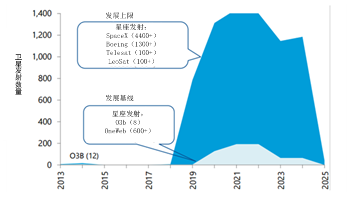 与GEO-HTS快速发展相比,多个大型中地球轨道(MEO)和低地球轨道(LEO)HTS星座进入研制当中,最早于2019年起发射。虽然国外宣称发展的中低轨HTS星座主要有6个,但由于建设的重复性,所需的资金规模,频率协调,制造、发射能力的限制导致最终能够发展起来的星座项目并不如宣传所述。