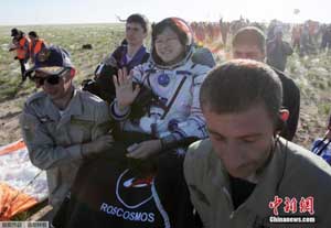 来自美国、日本、俄罗斯的三名宇航员相继安全出仓,图为来自日本的宇航员Kanai。