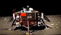 “玉兔”月球车拍摄的软着陆的“嫦娥三号” · “回”为第三期。未来,我们的航天员不能当滞留的“嫦娥”,而要随探测器返回地球。同时科学家也需要在地球对月球样本进行分析。因此,这个阶段需要能把月球车采集到的样品带回来的技术。“回”不是指绕月球飞行的卫星回来,而是说登上月球的探测器能回到地球。尚未发射的“嫦娥五号”的任务就是无人自动采样返回。