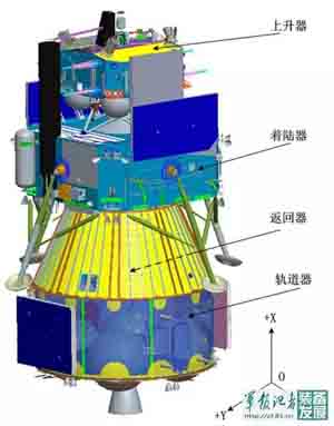 “嫦娥五号”原本计划是2017年11月发射,之前已经正样测试,但因故推迟。“嫦娥五号”探测器全重8.2吨,由轨道器、返回器、着陆器、上升器四个部分组成,如下图所示。“嫦娥五号”发射的困难主要有4个方面:月球轨道的交会对接、月面采样、月面起飞和高速返回。“嫦娥五号”落月后,将在月球表面上采集大约2公斤重的月面土壤等样本,然后封装放进着陆器的上升段,该段从月面点火升空进入月球轨道,并与轨道器和返回器的联合体交会对接,将样品转移至返回器内,轨道器携带返回器点火飞向地球,在进入大气层前分离,轨道器脱离开到太空中,返回器将降落在内蒙古境内的草原上。