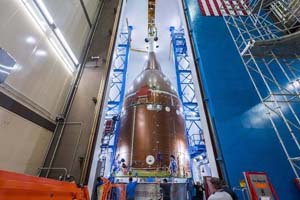 NASA的猎户座结构测试项目(STA),在其“全栈”发射条件下,被提升到洛克希德·马丁丹佛园区的混响声学室。